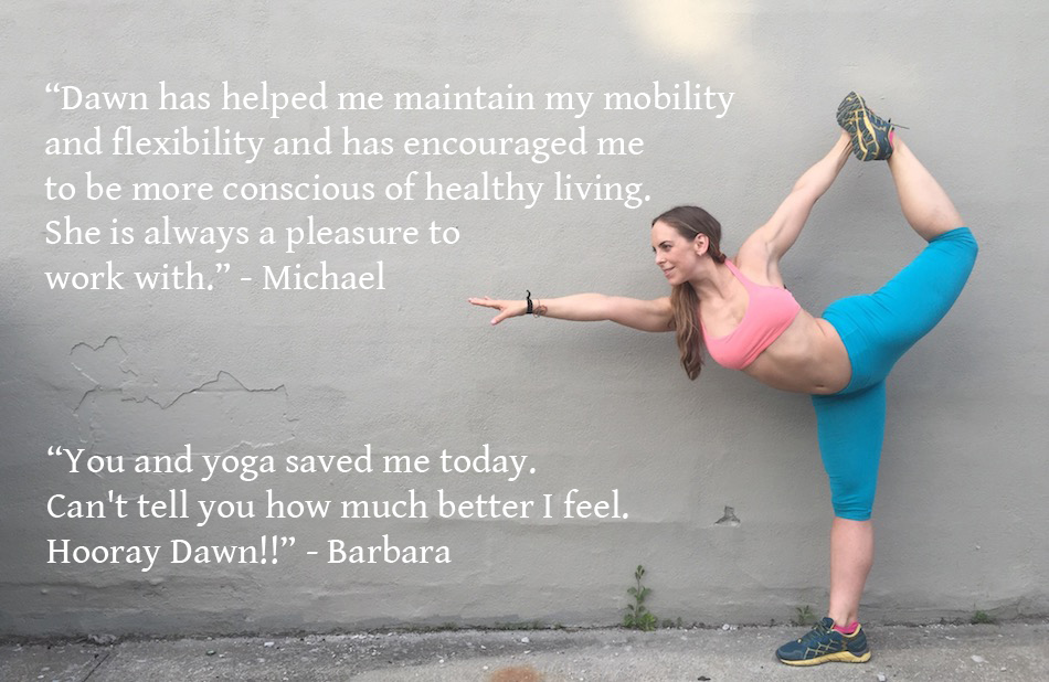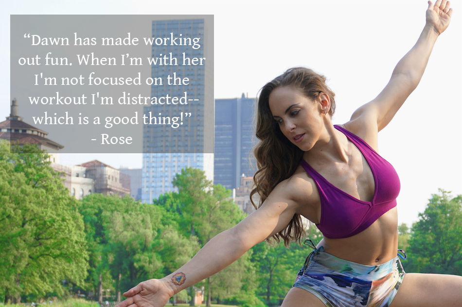 “Dawn is very easy to work with--she somehow picks up on what your body is feeling and adjusts the workout that works best for you that day. “ - Rose - training & yoga with Dawn since 2013